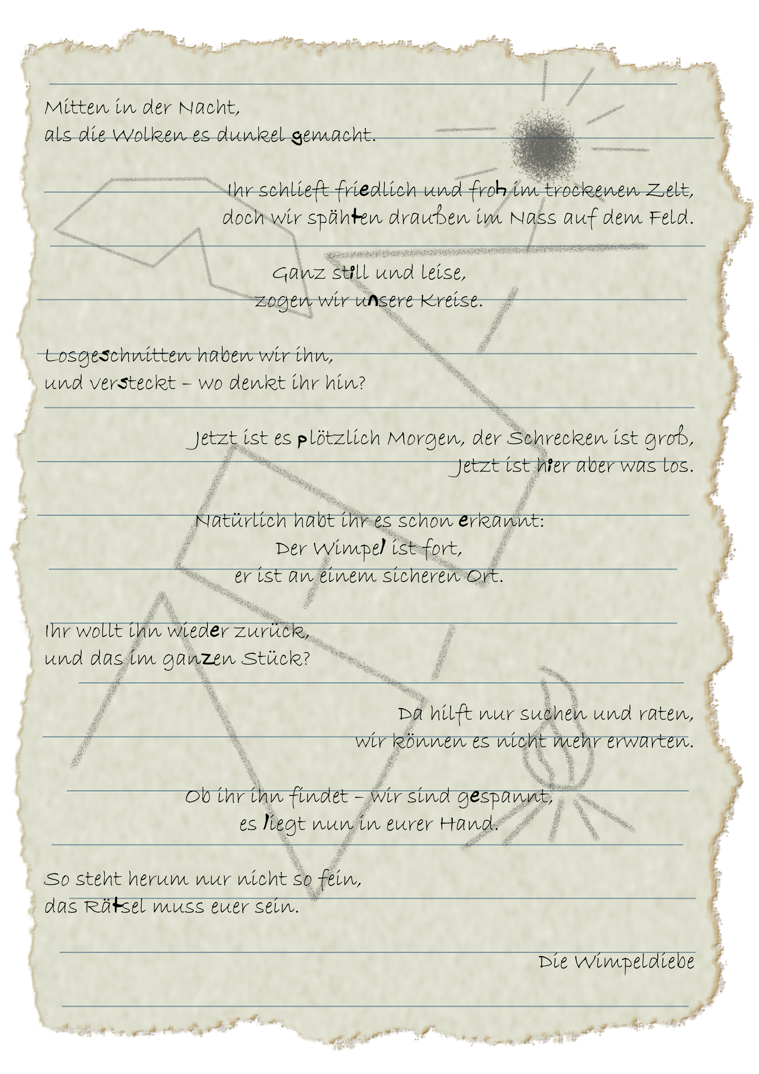 Müde wacht ihr am nächsten Morgen durch den Weckgesang der Leiter auf und braucht einen Moment, um euch an die Ereignisse der vergangenen Nacht zu erinnern. Ein Blick aus euren Zelt verrät euch aber, dass es kein schlechter Traum war, sondern der Wimpel tatsächlich weg ist. Oh Mann – wie sollt ihr das nur dem Rest des Zelas erklären... Immer noch niedergeschlagen versammelt ihr euch nach dem Frühstück in eurem Zelt, wo bereits etwas auf euch zu warten scheint: